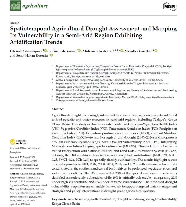 The article entitled “Spatiotemporal Agricultural Drought Assessment and Mapping Its Vulnerability in a Semi-Arid Region Exhibiting Aridification Trends” is accepted for publication in Agriculture.