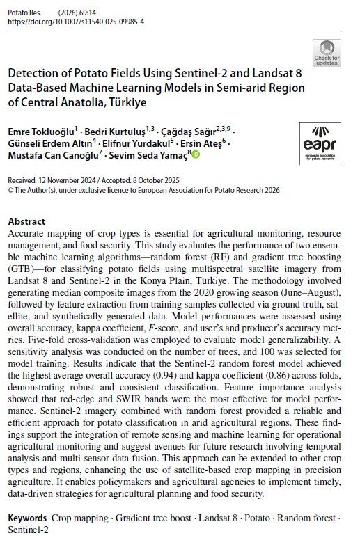 The article entitled “Detection of Potato Fields Using Sentinel-2 and Landsat 8 Data-Based Machine Learning Models in Semi-arid Region of Central Anatolia, Türkiye” is accepted for publication in Potato Research.